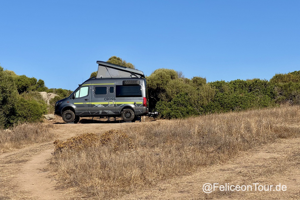 Es gibt auf dem Stellplatz mehrere Bereiche in denen man den Camper abstellen kann. Wir konnten mit unserem Camper durch den große Bodenfreiheit mitten auf einem Hügel zwischen den wenig schattenspendenden Bäumen stehen und entgingen damit den in Reihe stehenden weissen Campern. Auf dem Platz existieren zwei Toiletten und zwei Duschen, die als wir vor Ort waren, vollkommen ausreichend sind. Im Hochsommer zieht es die meisten Camper doch eher an den Strand und der ist von hier aus zu Fuss doch etwas weit.